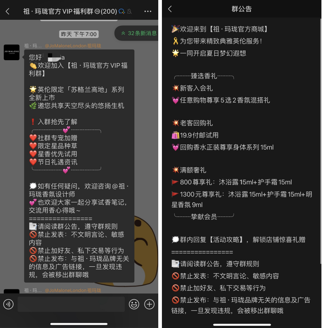 用戶入群后會(huì)第一時(shí)間觸發(fā)自動(dòng)歡迎語,介紹當(dāng)前社群福利及社群規(guī)則。群公告內(nèi)容則更為詳細(xì),介紹具體活動(dòng)內(nèi)容。
