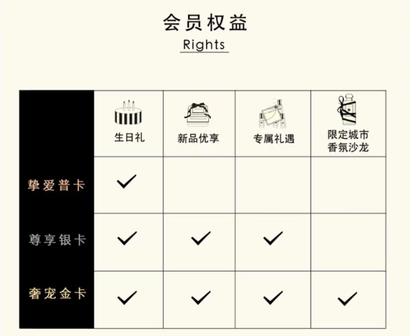 奢寵金卡:一次性或連續(xù)12個(gè)月累計(jì)實(shí)付消費(fèi)金額滿5000元,享享生日禮、新品優(yōu)享、專屬禮遇、限定城市香氛沙龍權(quán)益