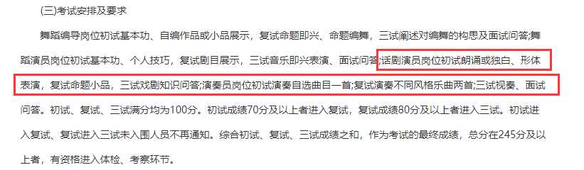 同樣的,此文工團的話劇演員考試也是三部分,總分在245分以上的人,才有資格進入體檢環(huán)節(jié)。