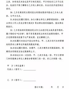 創(chuàng)業(yè)期滿后一個月內(nèi),乙方未申請回原單位的,甲方可以按自動離職予以處理。 七、離崗創(chuàng)業(yè)期間,乙方必須遵紀(jì)守法,不得出現(xiàn)有損甲方信譽(yù)和形象的言行,其個人的人身安全及由其個人不良行為產(chǎn)生的影響、后果均由其自行承擔(dān),與甲方無關(guān)。