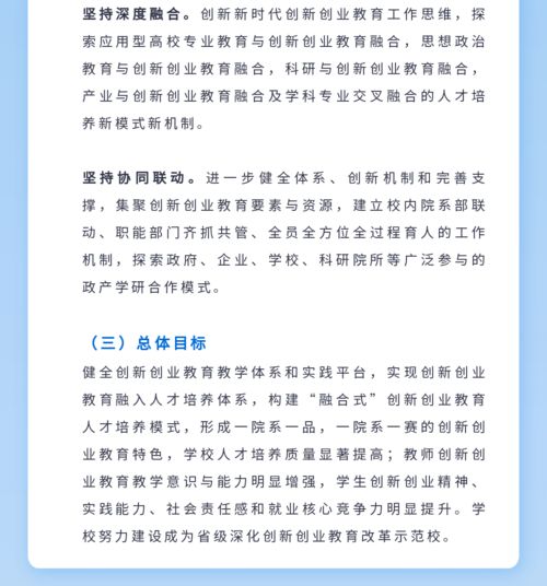 3、協(xié)同性原則 創(chuàng)新創(chuàng)業(yè)教育是以培養(yǎng)大學(xué)生創(chuàng)新創(chuàng)業(yè)素質(zhì)為總目標(biāo),通過(guò)開(kāi)設(shè)相關(guān)課程和開(kāi)展相關(guān)實(shí)踐、模擬、體驗(yàn)教學(xué)環(huán)節(jié),在與基礎(chǔ)教育、專(zhuān)業(yè)教育和職業(yè)教育等有機(jī)融合的基礎(chǔ)上形成的提高大學(xué)生綜合素質(zhì)、促進(jìn)大學(xué)生全面發(fā)展的一種新型教育理念和模式。 4、特色化原則 立足辦學(xué)定位,凝練學(xué)校特色。