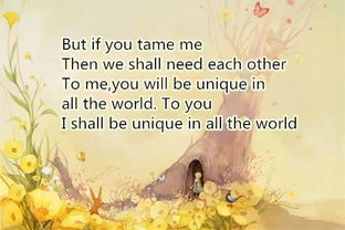 但是,如果你馴服了我,我們就互相不可缺少了。對(duì)我來(lái)說(shuō),你就是世界上唯一的了;我對(duì)你來(lái)說(shuō),也是世界上唯一的了。