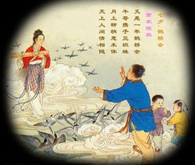 牛郎按照老牛的話做了,穿上牛皮做的鞋,拉著自己的兒女,一起騰云駕霧上天去追織女,眼見就要追到了,豈知王母娘娘拔下頭上的金簪一揮,一道波濤洶涌的天河就出現(xiàn)了,牛郎和織女被隔在兩岸,只能相對哭泣流淚。他們的忠貞愛情感動了喜鵲,千萬只喜鵲飛來,搭成鵲橋,讓牛郎織女走上鵲橋相會,王母娘娘對此也無奈,只好允許兩人在每年七月七日于鵲橋相會。
