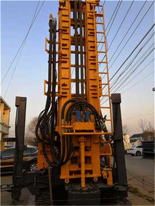 2、把打井機轉(zhuǎn)盤孔中心對準所挖圓井中心,放置鉆井機。從井架上面的滑輪上垂下一根繩子并系一物體,調(diào)整支腿使繩子對準轉(zhuǎn)盤孔中心,支腿下面要墊上大木塊,使支腿穩(wěn)定可靠。