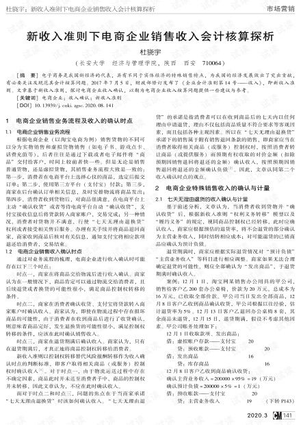 借:銷售費(fèi)用 貸:其他貨幣資金-支付寶賬戶存款6、好評(píng)返現(xiàn)時(shí); 借:銷售費(fèi)用 貸:銀行存款(其他貨幣資金-支付寶賬戶存款)7、客戶收貨后破損或不滿意時(shí);借:營業(yè)外支出 貸:銀行存款(其他貨幣資金-支付寶賬戶存款)三、費(fèi)用相關(guān)賬務(wù)處理:1、固定費(fèi)用 ① 保證金(押金); ② B店的技術(shù)服務(wù)費(fèi); ③ 旺鋪費(fèi); ④ 數(shù)據(jù)魔方費(fèi); ⑤ 營銷工具費(fèi);2、銷售費(fèi)用 ① 推廣費(fèi);a、充值時(shí): 借:其他貨幣資金-賬戶存款 其他貨幣資金-鉆展賬戶存款 貸:其他貨幣資金-支付寶賬戶存款b、使用消耗時(shí): 借:銷售費(fèi)用 貸:其他貨幣資金-直通車賬戶存款 其他貨幣資金-鉆展賬戶存款② 傭金; 借:銷售費(fèi)用 貸:其他貨幣資金-支付寶賬戶存款3、管理費(fèi)用4、財(cái)務(wù)費(fèi)用四、稅務(wù)相關(guān)賬務(wù)處理五、財(cái)務(wù)報(bào)表、分析報(bào)告擴(kuò)展資料:交易類型及流程:網(wǎng)店訂單→在線付款至擔(dān)保方→發(fā)貨→確認(rèn)收貨→擔(dān)保方清算貨款(先付款后發(fā)貨、有第三方擔(dān)保、正常交易)1、提交網(wǎng)店訂單初次提交訂單時(shí)不須做會(huì)計(jì)處理2、在線付款至擔(dān)保方該筆款項(xiàng)未能確定最終是否流入企業(yè),此時(shí)不在線付款至擔(dān)保方不作會(huì)計(jì)處理;3、發(fā)貨發(fā)貨仍未能確定能否成交,不能確認(rèn)收入和成本,先從庫存商品轉(zhuǎn)為發(fā)出商品,借 : 發(fā)出商品貸 : 庫存商品; 由物流公司送貨時(shí)發(fā)生物流費(fèi)用,會(huì)計(jì)分錄如下:借 : 銷售費(fèi)用貸 : 應(yīng)付賬款或現(xiàn)金等4、確認(rèn)收貨交易成功可以確認(rèn)收入和成本,確認(rèn)收入分錄:借 : 應(yīng)收賬款貸 : 主營業(yè)務(wù)收入應(yīng)交增值稅-銷項(xiàng)稅結(jié)轉(zhuǎn)銷售成本分錄:借 : 主營業(yè)務(wù)成本貸 : 發(fā)出商品5、擔(dān)保方清算貨款收到經(jīng)第三方扣了手續(xù)費(fèi)的貨款,借 : 銀行存款或其他科目財(cái)務(wù)費(fèi)用貸 : 應(yīng)收賬款電子商務(wù)會(huì)計(jì)_百度百科。