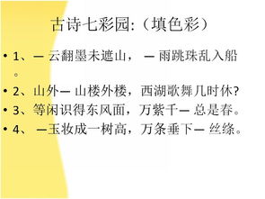(二)古詩(shī)七彩園:(填色彩) 1?春色滿園關(guān)不住,一枝 杏出墻來(lái)。 2?山外 山樓外樓,西湖歌舞幾時(shí)休? 3?等閑識(shí)得東風(fēng)面,萬(wàn) 千 總是春。
