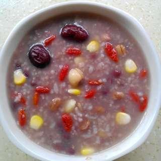 “八寶粥”采用的原料除了大米或糯米外,還添加小米、豆類、核桃仁、花生仁、紅棗、桂圓、蓮子、山藥、枸杞子等,是蛋白質(zhì)互補作用在食物中的典型應(yīng)用。谷類缺乏賴氨酸,而豆類賴氨酸含量比較高;小米中含亮氨酸比較多;各種堅果類富含人體必需脂肪酸以及各種微量元素和多種維生素;所選中藥也是具有滋補調(diào)養(yǎng)、健體作用的藥材。五谷雜糧混合煮粥可以充分發(fā)揮氨基酸的互補作用,相互取長補短,提高蛋白質(zhì)的利用率。
