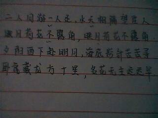 ——《西洲曲》(蓮-憐)李商隱《無題》“春蠶到死絲方盡,蠟燭成灰淚始干”(絲諧思) 諧音古詩真沒多少,下面是對聯(lián):二猿落入深山中,小猴子怎敢對鋸(對句) 一馬陷足污泥里,老畜牲怎能出蹄(出蹄) 兩舟并濟(jì),櫓速(魯肅)不如帆快(樊噲) 八音齊奏,笛清(荻青)怎比蕭和(蕭何) 身居寶塔,眼望孔明,怨江圍(姜唯)實(shí)難旅步(呂布) 鳥處籠中,心思槽巢(曹操),恨關(guān)羽不得張飛 燈籠籠燈,紙(枳)殼原來只防風(fēng) 鼓架架鼓,陳皮不能敲半下(夏) 孔子生于舟(周)未 光舞(武)起自漢中 (光舞:閃電;漢中:天空)狗啃河上(和尚)骨 --蘇 軾 水流東坡詩(尸) --佛 印 向陽門第春常在 --蘇 軾 積善人家慶(罄)有余(魚) --佛 印 整理得很辛苦,希望采納,謝謝。
