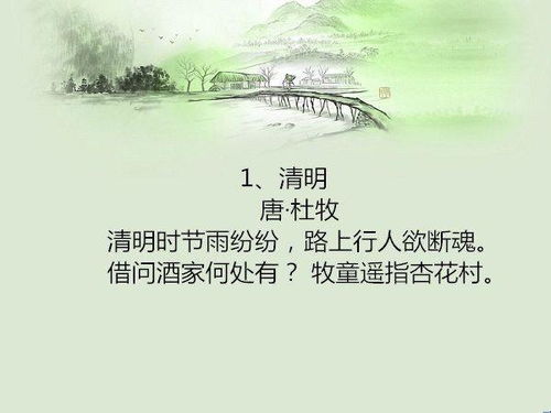 清明杜牧 〔唐代〕清明時(shí)節(jié)雨紛紛,路上行人欲斷魂。