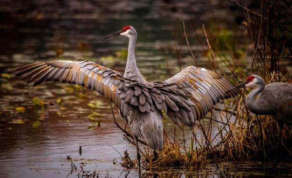 沙丘鶴:別名棕鶴_大沙丘鶴_古巴沙丘鶴_加拿大沙丘鶴,為鶴形目、鶴科、鶴屬鳥類,原產(chǎn)于北美洲及西伯利亞東北部,包括中國、加拿大、美國、古巴、日本、韓國、墨西哥、俄羅斯等地。模式產(chǎn)地在加拿大哈得遜灣。野生于富有灌叢和水草的平原沼澤、湖邊草地、水塘及河岸沼澤地帶,有時也出現(xiàn)在有樹木和草本植物的高原地帶。1758年命名,共6個亞種。因工業(yè)、水利、捕魚、放牧、開荒、放水養(yǎng)葦與割葦?shù)?,造成棲息地的破壞,造成?shù)量下降。1989年被列為我國2級重點保護野生動物。