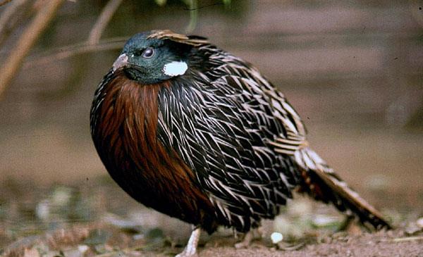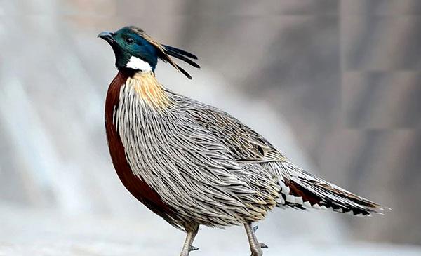 體長39-63cm,重750-1100g。雄鳥頭頂棕褐,冠羽細長,同色而較棕。頸側(cè)在耳羽后面下方有一大形的白色塊斑,下眼瞼具一小白斑。頭的余部包括頦、喉等均為黑色。上體羽毛呈披針形,概紫灰色。尾上覆羽及中央尾羽,其中部為褐灰色。外側(cè)尾羽灰色,具三道黑色橫斑,近端黑斑較寬。肩羽大都棕褐色,貫以白色或皮黃色羽干紋。尾下覆羽暗栗,具黑色次端斑和白色端斑。虹膜褐色,嘴黑,腳暗紅色。