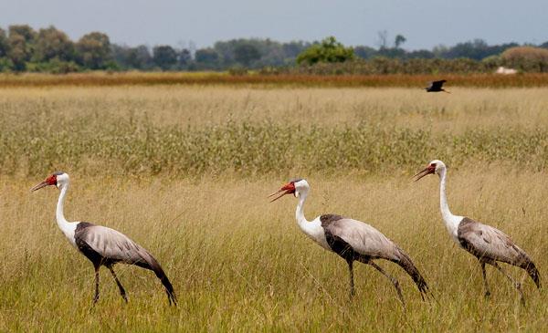 肉垂鶴:別名吐綬鶴,為鶴形目、鶴科、肉垂鶴屬鳥類,原產(chǎn)于非洲東南部,包括塞俄比亞、坦桑尼亞、莫桑比克、安哥拉、南非等地?,F(xiàn)存數(shù)量約6000-8000只。因原生地區(qū)的濕地開發(fā),導(dǎo)致其棲息地日趨縮小和破碎化,數(shù)量呈下降趨勢(shì)。現(xiàn)已被IUCN列為易危物種。全世界有15種鶴,除了南美和南極以外,世界其它大陸都有鶴分布。鶴類起源于西半球,然后擴(kuò)展到亞洲(9種)、非洲(6種)、大洋洲(2種)、北美洲(2種)。