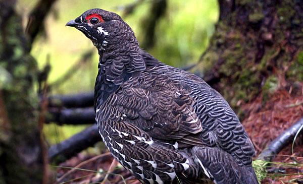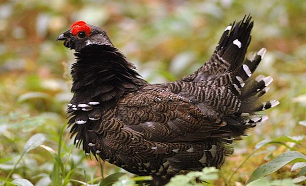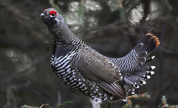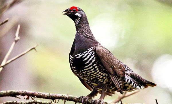 體長37-41cm,重600-700g。黑色喉塊的外緣白色。上體橄欖褐色而帶黑斑,腹白而具黑斑。中央尾羽褐色,外側尾羽黑色帶較寬的白色羽尖。紅色的眉瘤凸顯。與體型較小的榛雞的區(qū)別在于胸部及上背近黑色,羽冠短,及特征性的狹尖形初級飛羽。頭頂?shù)胶箢i為灰橄欖色或沙黃色,具窄的黑色斑紋。翅膀短圓,最特殊的是翅膀上的初級飛羽硬窄而尖,呈鐮刀狀。虹膜為黃褐色,眼上緣皮膚裸露,鮮紅色。嘴為黑色,腿上被有羽毛,腳和趾為黃褐色。