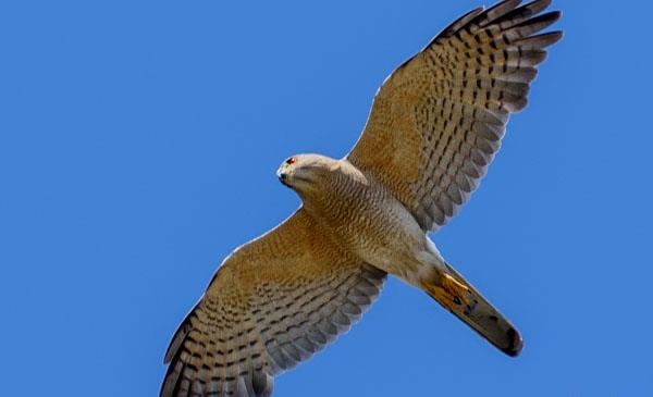 雌鳥似雄鳥,但背褐色,喉灰色較濃。亞成鳥:灰褐色具棕色鱗狀紋,下體具褐色棕紋及黑色羽干紋。與雀鷹亞成鳥的區(qū)別在下體具棕紋,與松雀鷹亞成鳥的區(qū)別為上體色淡,尾部橫紋較窄。