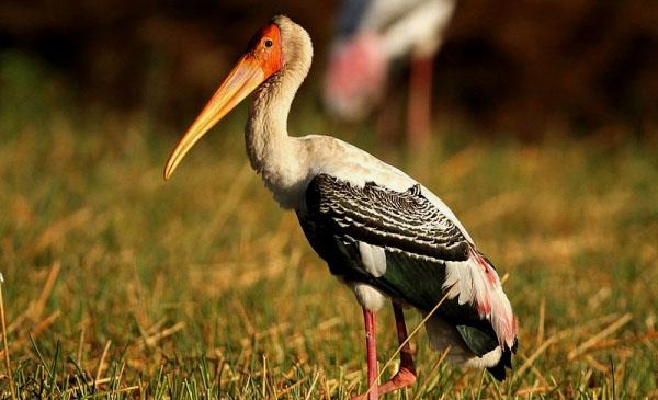 體長93-102cm,重2-3.5kg。橙色的頭部赤裸無羽,繁殖期變?yōu)榧t色。橙黃色的嘴粗而長,但嘴尖稍微向下彎曲,與白鸛、黑鸛等鸛屬鳥類明顯不同。通體白色。胸具寬闊的黑色橫帶。頭的前半部裸出無羽,呈橙色。嘴橙黃色,長而粗,先端向下彎曲,腳亦特長,紅色,脛的下部裸出。虹膜淡黃色,嘴橙黃色,基部紅色,腳和趾褐色或肉褐色。