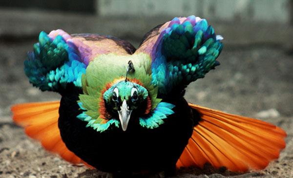 尼泊爾國鳥,又名九色鳥,非常美麗,尤其是雄鳥色彩極為絢麗,頭頂有一簇特別延長的藍(lán)綠色羽冠,其羽干細(xì)而裸出,羽端呈匙狀,向前卷曲,如同絲絨一般,甚為奇特,是虹雉中羽冠最漂亮的。