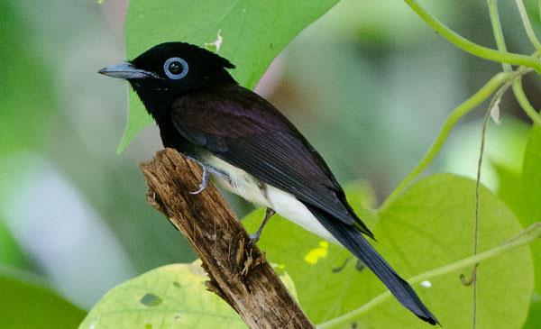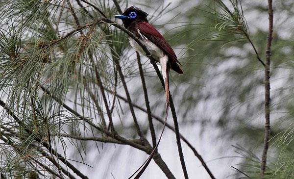 頭體長19-21cm,雄鳥計(jì)尾長40cm左右,重19-25g。喙基較寬闊,嘴強(qiáng)健,上喙先端稍下彎并具銳鉤,有較發(fā)達(dá)的口須。翅尖,尾叉形。腿、腳強(qiáng)健,爪鉤狀。成年雄鳥胸部的羽毛呈黑灰色,有紫藍(lán)色的光澤,具冠羽。下身則是白色。翼、背部及臀部呈黑栗色。尾巴中央有極長的黑色尾羽,雄雛鳥的此尾羽則較短。虹膜深褐,眼周裸露皮膚藍(lán)色,嘴藍(lán)色,腳偏藍(lán)。可發(fā)出笛聲及甚響亮的chee-tew聯(lián)絡(luò)叫聲,似黑枕王鹟叫聲,但較強(qiáng)烈。