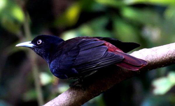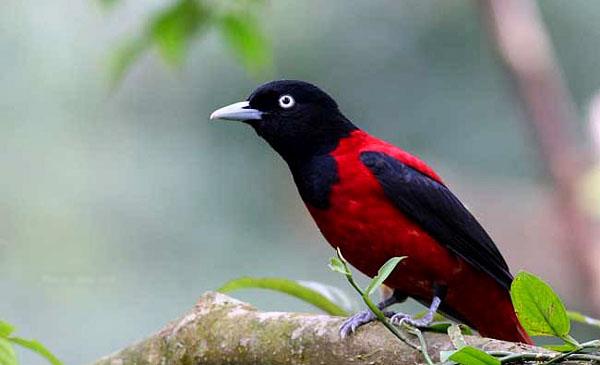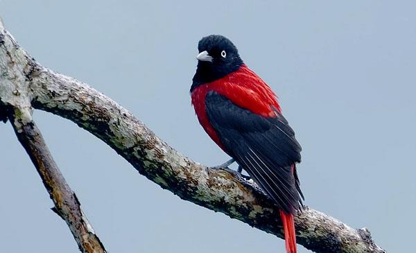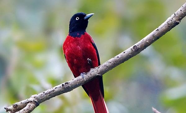 雄鳥絳紫紅色,頭、上胸及翼黑色。雌鳥上背及背部深灰色,尾覆羽及尾絳紫紅色,腹部及下胸白而密布黑色縱紋。幼鳥和雌鳥相似,但下體較白而少灰褐色,兩脅和胸綴有紅色。與鵲色鸝幼鳥的區(qū)別在上背灰色較深,下體白色較少且縱紋較粗。幼鳥比雌鳥色淺,喉顯白。