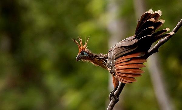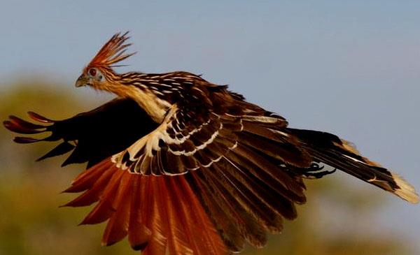 麝雉:別名爪羽雞,為鵑形目、麝雉科、麝雉屬鳥類,原產(chǎn)于南美洲中部及北部,包括玻利維亞、巴西、哥倫比亞、厄瓜多爾、圭亞那等國。棲息于亞馬遜河流域的水淹森林、洪澇雨林,不善于飛行卻擅長游泳,所以常常在水面上方的樹枝上筑巢活動以便及時泅水逃咶生、躲避敵害。1776年命名,無亞種。