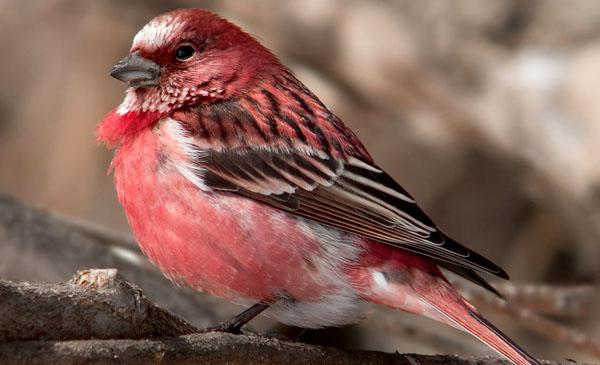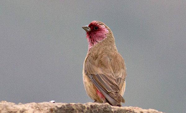 頭體長13-15cm,重17-22g,沙色朱雀雄性前額基部、眼先、眼周赤紅色。頭頂和眉紋珠白色而沾粉紅。頰和耳羽玫瑰紅,沾赤。尾上覆羽沙褐,尾羽暗褐,羽緣沙褐。小覆羽淡沙褐色,沾玫紅,中、大覆羽沙褐。小翼羽和初級(jí)覆羽暗褐,羽緣紅褐,飛羽暗褐,具沙褐色羽緣。喉玫瑰紅而沾赤,胸粉紅色而沾玫瑰紅,并微具珠白色鱗斑。嘴短粗而強(qiáng)壯,呈圓錐狀,嘴峰稍曲。