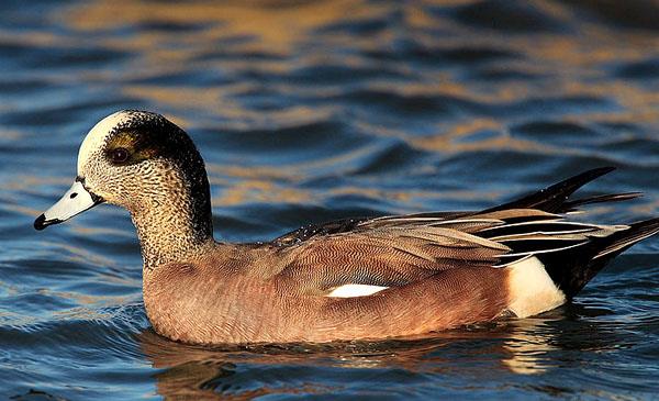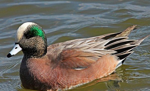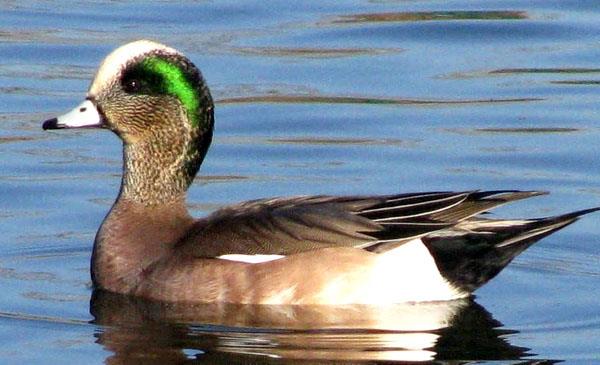 體型中等,與赤頸鴨形態(tài)相似,但體型略大,白額頭較大,尾巴較長。繁殖期雄鳥寬闊的綠色眼線橫貫蒼白色的頭部而極易分辨。腳趾間有蹼,善于在水中游泳和嬉戲,但很少潛水,游泳時尾巴露出水面。