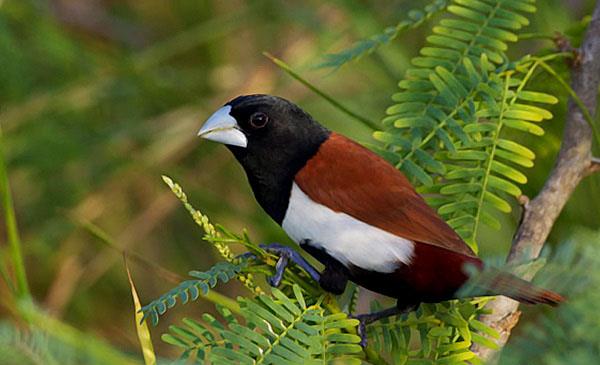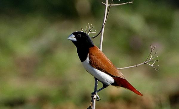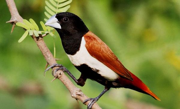 栗腹文鳥:別名,為雀形目、文鳥科、文鳥屬鳥類,原產(chǎn)于亞洲中部及南部,包括中國、尼泊爾、印度、斯里蘭卡、孟加拉國、緬甸、泰國、中南半島、馬來半島、菲律賓和印度尼西亞等地。棲息于海拔1000m以下的低山丘陵和平原地帶的灌叢、草叢和農(nóng)田中,也見于果園、蘆葦叢和村舍附近。1766年命名,共2個亞種。