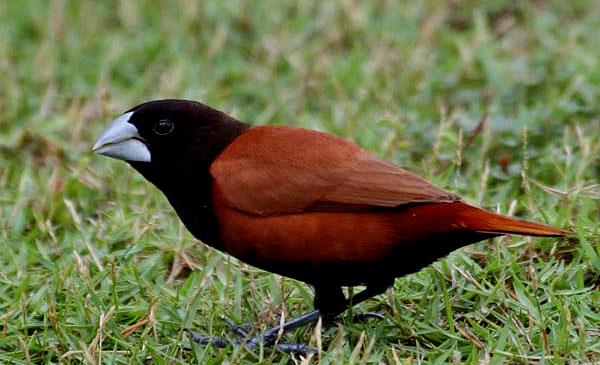 整個頭、頸和上胸黑色,其余體羽栗色,并富有光澤。下胸和腹中央至尾下覆羽黑色,尾栗紅色。背、肩和兩翅覆羽淡栗色,腰和尾上覆羽深栗色。鳴聲尖似笛聲,飛行時常發(fā)出三聲顫鳴。