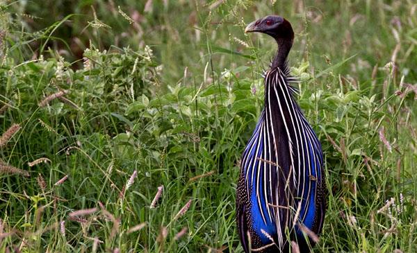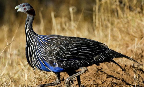 頭體長61-70cm,重1.1-1.8kg。成鳥頭和頸部裸露呈黑藍色,體結(jié)實,喙短,呈圓錐形,適于啄食植物種子。腳強健,具銳爪,善于行走和掘地尋食。全身的羽毛由鈷藍色、淡紫色、黑色和白色混合,豐富多彩,絢麗異常。長長的腿,在灌木林冠間奔跑,可以持續(xù)50-100m。雖然沒有其他珠雞的鳳頭,但是這個物種因為它長長的脖子和頭部,看起來特別像一只禿鷲,因經(jīng)得名鷲珠雞。
