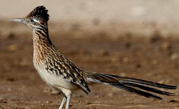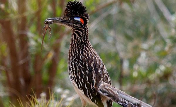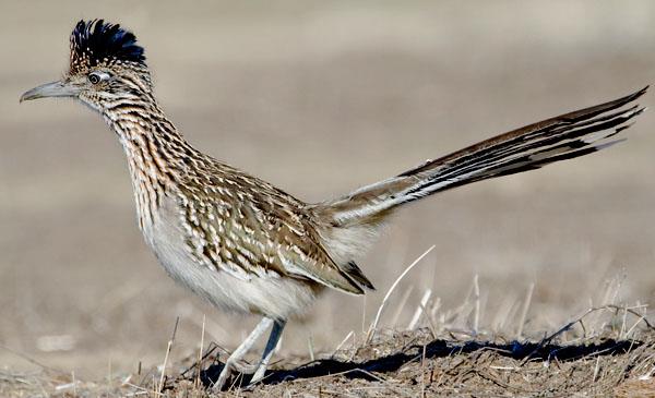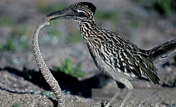 加州走鵑:別名灌叢雞_跑路鳥,為鵑形目、杜鵑科、走鵑屬鳥類,原產(chǎn)于北美洲至中美洲,包括美國(guó)、加拿大、墨西哥、格陵蘭、百慕大群島等地。喜歡沿著道路快速跑或穿行于荒原、灌木叢,捕食昆蟲、蜥蜴和蛇。1829年命名。捕到爬蟲類后,用結(jié)實(shí)的喙將其啄死,然后從頭部開(kāi)始吞下。一旦與響尾蛇相遇,就會(huì)爆發(fā)一場(chǎng)生死搏斗,它跳躍著躲開(kāi)響尾蛇的攻擊,并尋找機(jī)會(huì)撲到蛇的嘴后,用喙和腳爪猛擊蛇頭,如果它勝利,它將得到一頓美餐。但如果失敗,代價(jià)就是死亡,但它從不退縮。