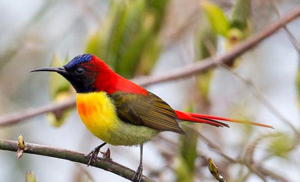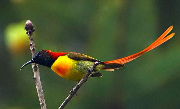 火尾太陽鳥:別名,為雀形目、太陽鳥科、太陽鳥屬鳥類,原產(chǎn)于亞洲南部孟加拉、不丹、中國(guó)、印度、緬甸、尼泊爾和泰國(guó)。屬高山鳥類,棲息于海拔2000-3000m間的山地、溝谷或村寨附近的次生闊葉林、開花的灌叢中,有時(shí)也見于芭蕉樹上。冬季下降到海拔1500米的低山和山腳平原地帶,有時(shí)甚至進(jìn)到果園,農(nóng)地和村寨附近的小林內(nèi)。1837年命名,共2個(gè)亞種。該物種的模式產(chǎn)地在尼泊爾。