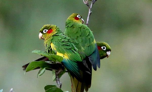 體羽綠色,前額、頭頂、頸部、頭部后方、眼睛和鳥喙之間、臉頰的羽毛都帶有些黃色的滾邊。耳羽為紅色,耳羽、下巴、喉嚨以及胸部均帶有不同程度的桔紅色。是非常合群愛社交的鳥種,??梢钥匆妿字圾B緊靠在一起彼此互相理毛。