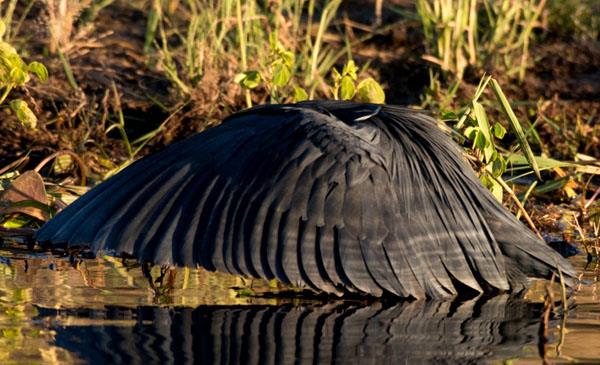 頭體長42-66cm,翼展90-95cm。體羽黑色,腿和腳黃色。黑喙長而尖直,翅大而長,腳和趾均細長,脛部部分裸露,體羽疏松,具深色條紋。背和前頸下部具有絲狀蓑羽。胸前有飾羽,頭頂有的有冠羽,在繁殖期時,這兩部分是重要的炫耀特征。腿部被羽,腳三趾在前一趾在后。