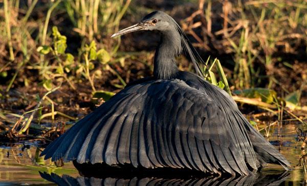 黑鷺:別名,為鸛形目、鷺科、白鷺屬鳥類,原產(chǎn)于非洲中部及南部的大部分地區(qū),包括安哥拉、貝寧、博茨瓦納、布隆迪、喀麥隆、乍得、剛果等國。棲息于濕地及附近林地,白晝或展昏活動,多在湖泊、河岸,潮汐淹沒的小溪和草地上出沒。1827年命名,無亞種。