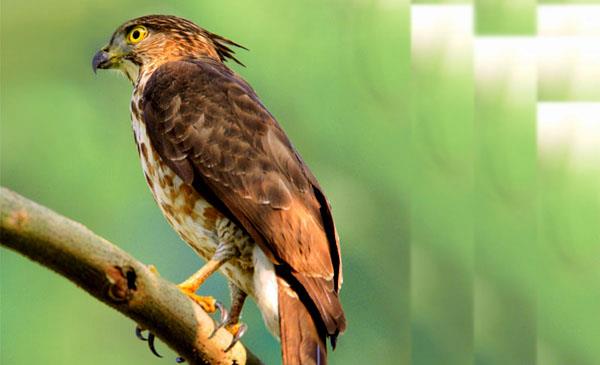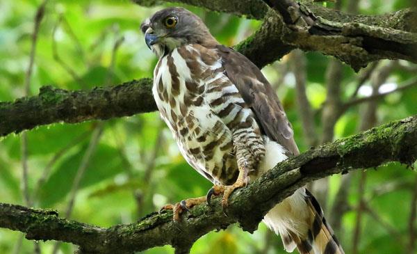 鳳頭鷹:別名鳳頭蒼鷹,為隼形目、鷹科、鷹屬鳥類,原產(chǎn)于亞洲南部,東南部,中國(西南地區(qū))、不丹、汶萊、柬埔寨、印度、印尼、老撾、馬來西亞、緬甸、尼泊爾、菲律賓、新加坡、斯里蘭卡、泰國、越南。野生于2000m以下的山地森林和山腳林緣地帶,也出現(xiàn)在竹林和小面積叢林地帶,偶爾也到山腳平原和村莊附近活動。1824年明敏,共11個亞種。上喙邊端具弧形垂突,適于撕裂獵物吞食?;烤呦災せ蝽殸钣?。