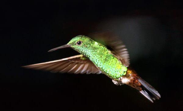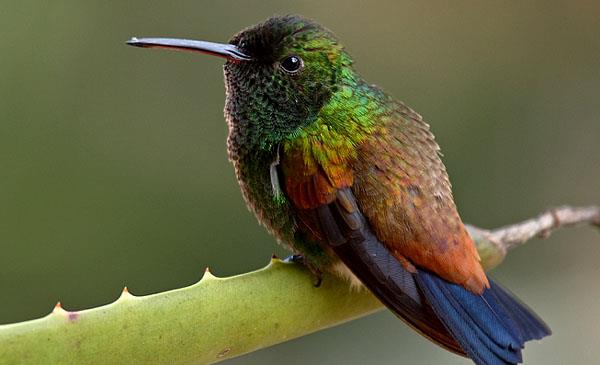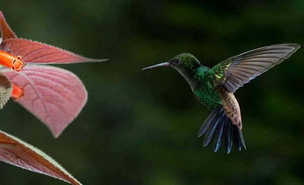 多巴哥蜂鳥(niǎo):別名銅色腰蜂鳥(niǎo),為雨燕目、蜂鳥(niǎo)科、栗腹蜂鳥(niǎo)屬鳥(niǎo)類(lèi),原產(chǎn)于南美洲加勒比海南部特立尼達(dá)和多巴哥特有物種,棲息于海拔1800m以下的森林地區(qū)、林地邊緣、花園公園、熱帶稀樹(shù)草原、多刺高灌叢。1788年命名,共8個(gè)亞種。許多本地植物的花在很大程度上依賴(lài)于多巴哥蜂鳥(niǎo)的授粉,主要是不能依賴(lài)蝴蝶和密封授粉的,一些筒狀花形的花朵。每天消耗的食品遠(yuǎn)超過(guò)它們自身的體重,為了獲取巨量的食物,它們每天必須采食數(shù)百朵花。