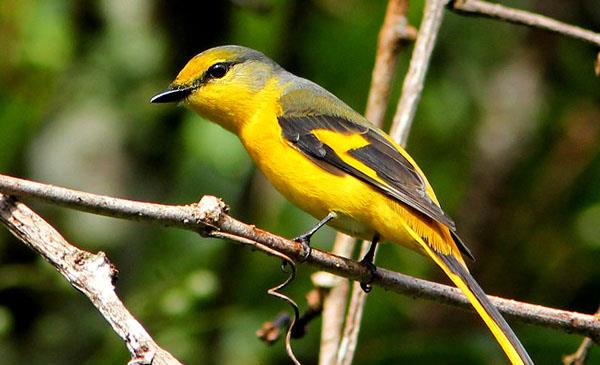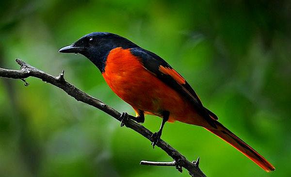 色彩濃艷的山椒鳥系列品種。兩性異形,背部均為黑色,腹部雄鳥紅色,雌鳥黃色,雌雄搭配在一起,十分的賞心悅目。常邊飛邊叫,叫聲單調(diào)尖細。覓食在樹冠層枝葉間或樹枝上,也在空中飛翔捕食。