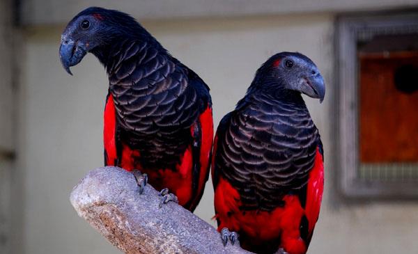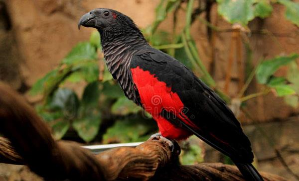 臉部沒(méi)有羽毛,外表與其它鸚鵡相去甚遠(yuǎn),頭部及鷹嘴狀的喙部特征與兀鷹或禿鷲尤為相似,黑色與鮮亮的紅色毛羽相當(dāng)美麗,不會(huì)與其他任何鸚鵡品種混淆,體羽僅有黑色和紅色,方形的尾加強(qiáng)了其特殊的形體輪廓。