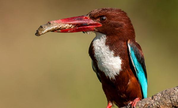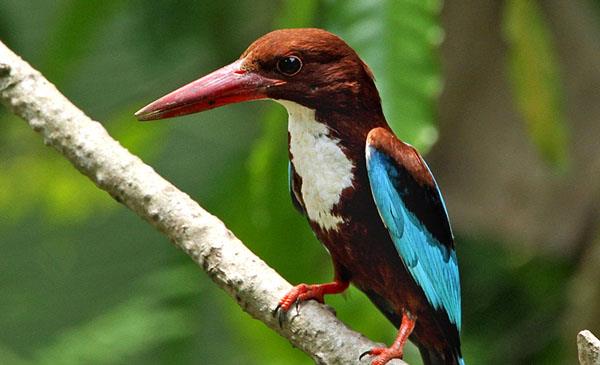 體長26-30cm,重50-100g。嘴赤紅,粗長似鑿,基部較寬,嘴峰直。頭的余部、后頸、頸側(cè)以及下體余部均深赤栗色,兩肋稍淡。成鳥的頦、喉、胸部中央純白。上背、肩及三級飛羽藍(lán)綠色,下背、腰及尾上覆羽均輝翠綠色。尾呈暗藍(lán)色,并具黑褐色羽干。除中央一對外,其余尾羽均內(nèi)緣以暗褐色。腋羽和翼下覆羽淡栗棕色。虹膜暗褐,嘴呈珊瑚紅以至赤紅色,腳和趾均珊瑚紅色。