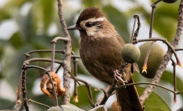 白頰噪鹛:別名白頰笑鶇_白眉笑鶇_白眉噪鹛,為雀形目、畫眉科、噪鹛屬鳥類,原產(chǎn)于亞洲中國(甘肅、陜西至長江以南的華南和西南各?。?、印度、緬甸、老撾、越南。野生于海拔2000米以下的低山丘陵和山腳平原等地的矮樹灌叢和竹叢中,也棲息于林緣、溪谷、農(nóng)田和村莊附近的灌叢、蘆葦叢和稀樹草地、甚至出現(xiàn)在城市公園和庭院。1867年命名,共4個亞種。我國南方常見的低山灌叢鳥類之一。常一只鳴叫,引起群中個體相互對鳴,經(jīng)久不息,鳴聲甚為嘈雜。