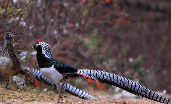 白腹錦雞:別名銅雞_筍雞_衾雞_箐雞_銀雞,為雞形目、雉科、錦雞屬鳥類,原產(chǎn)于亞洲中國(西藏、四川、云南、廣西)、緬甸東北部,棲息于海拔1500-4000m多巖的山地、常綠闊葉林、灌叢及矮竹間。冬季亦常下到農(nóng)田地帶活動和覓食。1829年命名,無亞種。170多年前,英國人便把白腹錦雞弄到倫敦飼養(yǎng)。