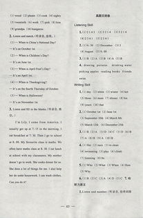 聽力部分答案 I. 1-5 BCBAC II. 6-10 TTFFT III. A. 11-15 √√*** B. 16. No, there isn't. 17. Ice cream. 18. At 7:00. 19. Two. 20. Because he can fly kites. IV. A. 21-25 CDABE B. 26. birthday 27. presents 28. guitar 29. flowers 30. yellow筆試部分 V. 31. piano 32. tomato 33. playing chess 34. planting trees 35. air-conditioner VI. 36-40 ABCDB 41-45 BCABC 46-50 CBABC VII. A. 51-55 CBADB B. 56-60 CBEFA VIII. 61-65 BCDAC IX. A. 66. 7:00 a.m. 67. do morning exercises 68. have Chinese class 69. 3:00 p.m. 70. eat dinner B. 71-75 FTTFT C. 76. Twelve. 77. Four. 78. No, he isn't. 79. She is a manager in a supermarket. 80. He often plays games with his little sister. X. 參考范文: In the Classroom Today is Friday afternoon. It's time to clean my classroom. Tom and Jim are cleaning the windows. Lily is cleaning the blackboard. Lisa is watering the flowers. She is very careful. The flowers are very beautiful. Monica is cleaning the desk. I am sweeping the floor. We are very tired, but we are very happy. How tidy the classroom is! (60 words) XI. 82. B 83. A 84. D 85. C 86. sport 附:聽力部分錄音原文 I. 聽辨單詞 聽音,從A,B,C三個選項中選出你所聽到的句子中含有的單詞。