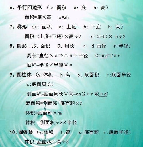 公式 S= a*h÷2正方形的面積=邊長(zhǎng)*邊長(zhǎng) 公式 S= a*a長(zhǎng)方形的面積=長(zhǎng)*寬 公式 S= a*b平行四邊形的面積=底*高 公式 S= a*h梯形的面積=(上底+下底)*高÷2 公式 S=(a+b)h÷2內(nèi)角和:三角形的內(nèi)角和=180度。長(zhǎng)方體的體積=長(zhǎng)*寬*高 公式:V=abh長(zhǎng)方體(或正方體)的體積=底面積*高 公式:V=abh正方體的體積=棱長(zhǎng)*棱長(zhǎng)*棱長(zhǎng) 公式:V=aaa圓的周長(zhǎng)=直徑*π 公式:L=πd=2πr圓的面積=半徑*半徑*π 公式:S=πr2圓柱的表(側(cè))面積:圓柱的表(側(cè))面積等于底面的周長(zhǎng)乘高。