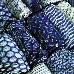 浸染到一定的程度后,最后撈出放入清水將多余的染料漂除,晾干后拆去纈結(jié),將“疙瘩“挑開,熨平整,被線扎纏縫合的部分末受色,呈現(xiàn)出空心狀的白布色,便是“花“;其余部分成深藍(lán)色,即是“地“,便出現(xiàn)藍(lán)底白花的圖案花紋來,至此,一塊漂亮的扎染布就完成了。“花“和“地“之間往往還呈現(xiàn)出一定的過渡性漸變的效果,多冰裂紋,自然天成,生動活潑,克服了畫面、圖案的呆板,使得花色更顯豐富自然。