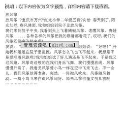今天,陽光明媚,微風把花的香氣散發(fā)到學校的每一個角落,連續(xù)的陰雨,好不容易盼來了晴天,同學們又議論開了:上周老師叫我們每位同學帶一個風箏到學校來,今天那么好的天氣,能去放風箏該多好啊。果然,第一節(jié)課,老師宣布:“今天下午我們?nèi)シ棚L箏?!薄班?!”同學們歡呼雀躍。