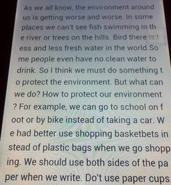 how to save environment? i think we should do the followings: first, it's best to ride a bike to school, don't take a bus or a taxi. second, i will remember to turn off the lights when i leave the classroom. third, in my free time, i will collect the empty bottles and waste paper for recycling. the fourth idea is turning off the shower when i 'm not using it. fifth, it is imporment to save water and money. also, i won't spend too much money on expensive things. last, we had better not cut down the trees, we have to take care of the trees . i'll try my best to save the energy, i hope i can do something for our country.。