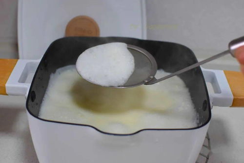 7、凝結(jié)的合適溫度在80~85度之間,如果太冷或者太熱,都容易失敗,可以使用溫度計,或者在豆?jié){煮沸后,立即倒入約為豆?jié){總量1/5的涼開水拌勻;