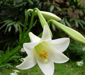 如麝香百合,又名鐵炮,花期6—7月,株高75—90厘米,葉短而厚實(shí),每株花蕾3—4朵,花色乳白色,喇叭形,花朵多,價(jià)格亦高。麝香百合喜涼爽潮濕環(huán)境,日光充足的地方、略蔭蔽的環(huán)境對(duì)百合更為適合。