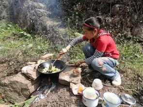 選一根帶叉的木棍插在地上,既要靠近火堆,又不可貼近,在上面擔上一根更長的棍子,棍子一端正好置于火的上方,用來掛野炊鍋,另一端用巖石壓住。這樣方便調節(jié)高度角度。