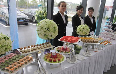 (4)冷餐會(huì)菜肴品種一般在20種以上,另外可備幾只造型菜,包括大型食品精雕,以增添氛圍,菜肴的一般擺法:造型菜正中主菜放中央,其他菜肴一色兩盆,對(duì)稱擺放,做到葷素色彩搭配均勻,熱菜應(yīng)置于保暖爐上。 (5)水果臺(tái)鋪放水果刀。