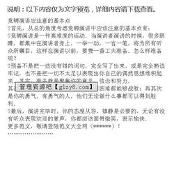 能夠辦到的就說,辦不到的就不要開“空頭支票”。五、調查研究,有的放矢競聘演講是針對某崗位而展開的,因此,寫作前必須到招聘單位了解情況,可以通過調查摸底、群眾訪談等方式,切實弄清楚單位的歷史、現(xiàn)狀,尤其對于當前存在的焦點、難點問題及其存在的根本原因要問清查透,力爭找到解決問題的最佳途徑,以便在演講時擊中要害,戰(zhàn)勝對手。